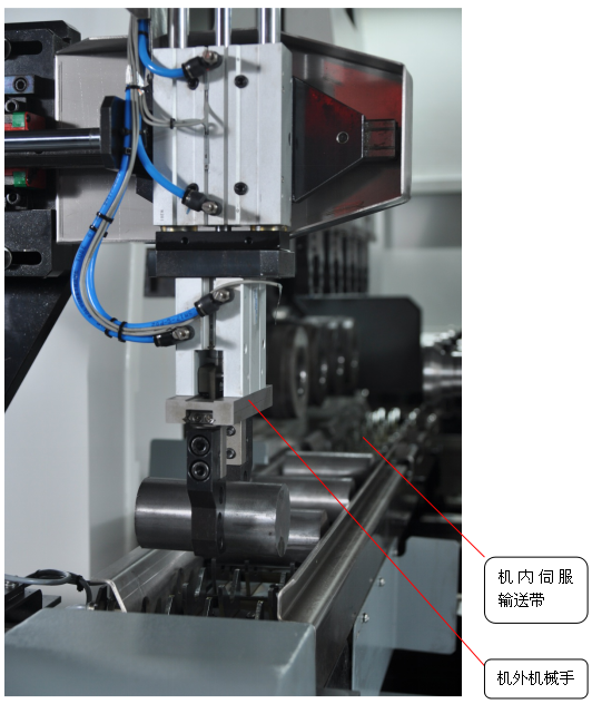 再由機(jī)外機(jī)械手將工件移放至機(jī)內(nèi)伺服傳送帶上。